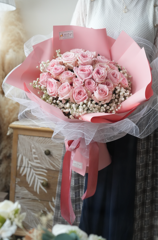 FQ002- 28枝粉色庭園玫瑰花束|生日花束|週年紀念花束