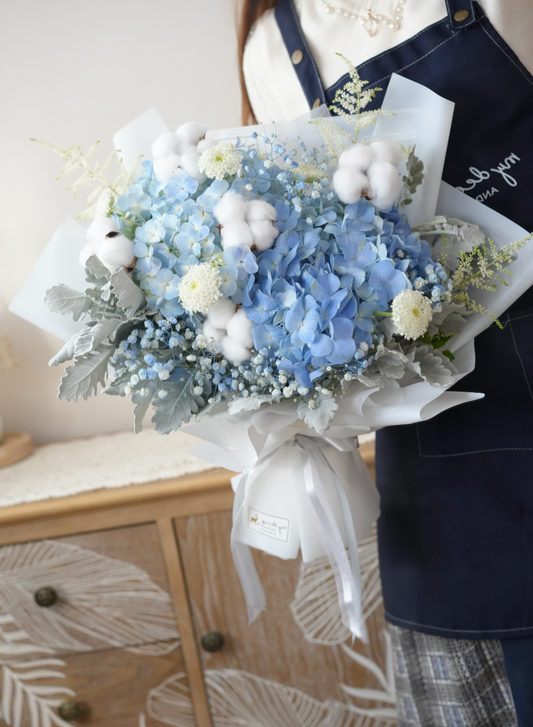 FQ016- 韓式深藍色繡球木棉鮮花花束|畢業花束|生日花束
