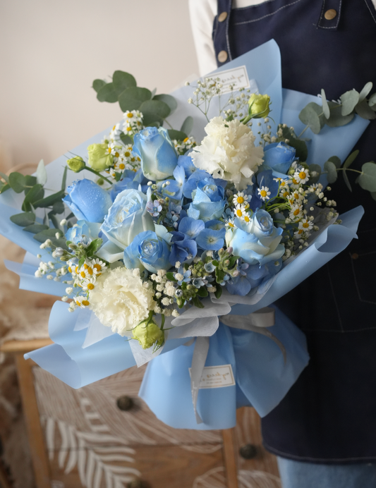 FQ036- 韓式深藍色繡球碎冰藍玫瑰鮮花花束|生日花束|畢業花束|升職榮休花束