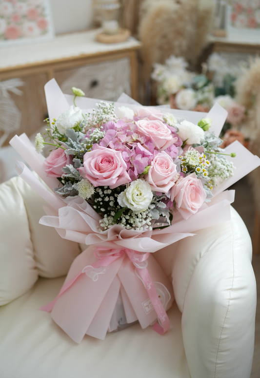 FQ044 - 韓式粉繡球玫瑰鮮花花束|生日花束|週年花束