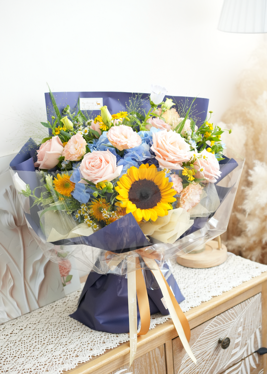FQ014- 自家染藍康乃馨、太陽花黃玫瑰花束|畢業花束|生日花束|感恩花束|升職榮休花束