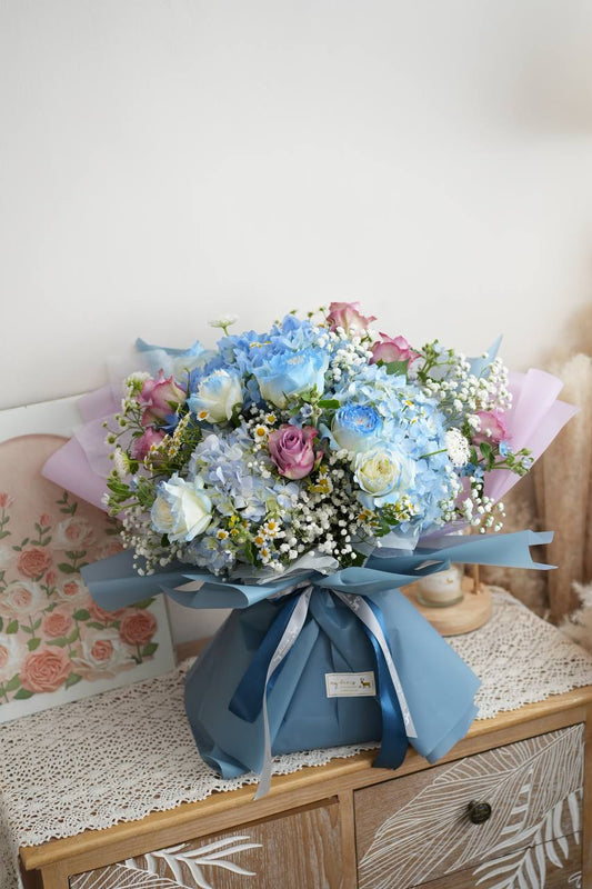 FQ041 - 繡球紫玫瑰白藍玫瑰鮮花束|畢業花束|生日花束|感恩花束|週年紀念花束|升職榮休花束