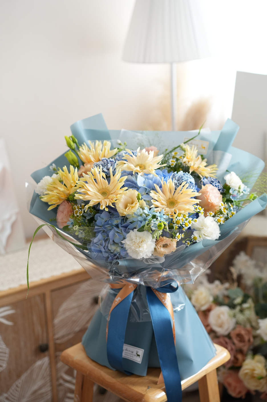 主要花材:藍色繡球花、卷邊奶黃非洲菊、自家染藍康乃馨、粉桔梗花 + 2-3款襯花