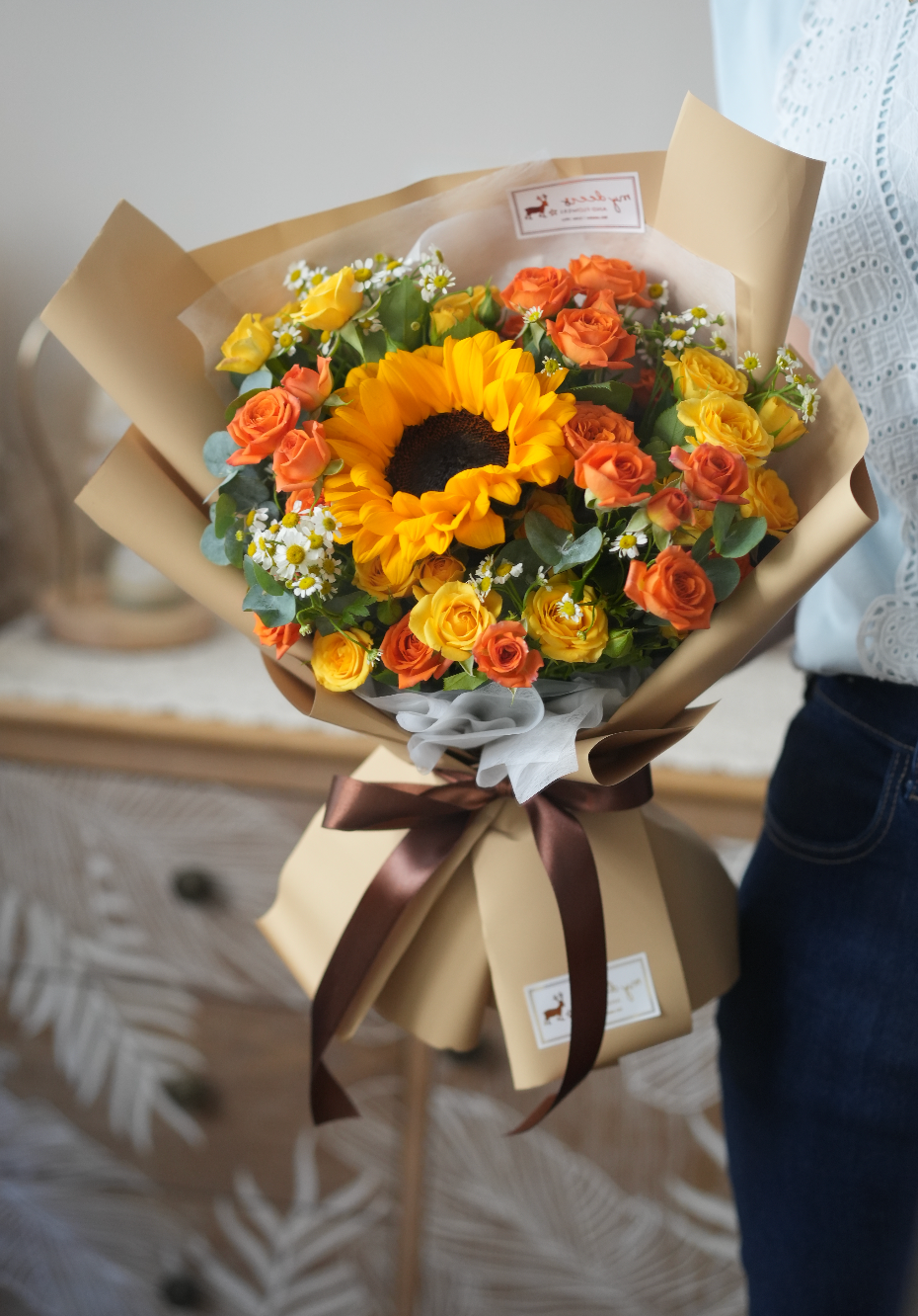 主要花材:兩款橙、黃色玫瑰花、洋甘菊、太陽花一枝,葉材,襯花