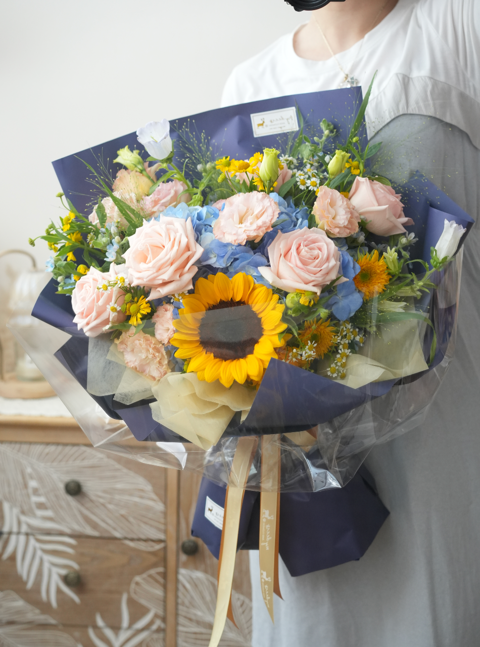 主要花材:藍色繡球花、香檳色大玫瑰、香檳色桔梗、太陽花一枝、洋甘菊,葉材,2-3款襯花 (共8款花材)