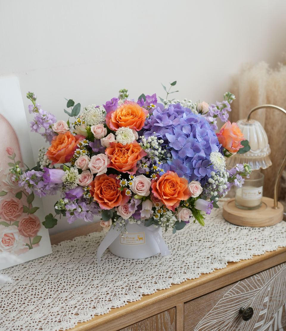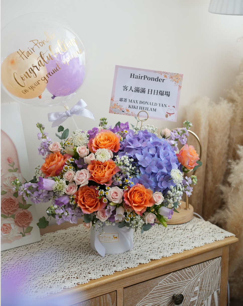 花材: 紫色繡球花、橙色大玫瑰、粉色小玫瑰、紫色紫羅蘭、洋甘菊、葉材 及 2-3款時令花材