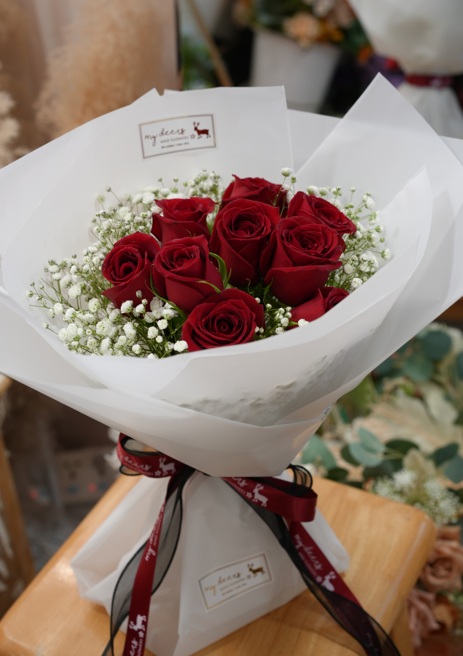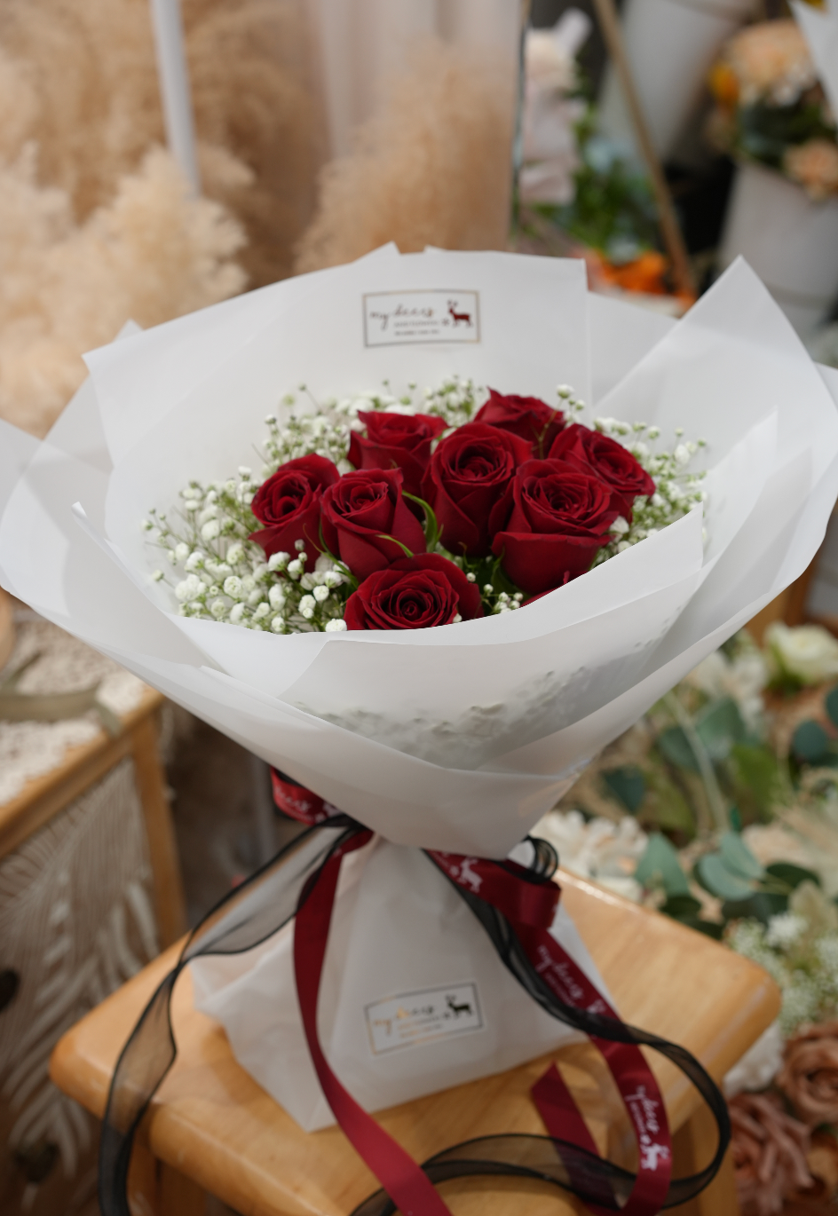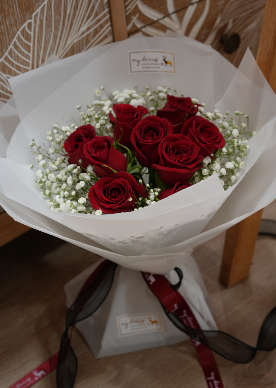 V007 - 鮮花花束 Classic 經典紅玫瑰滿天星花束|情人節花束|週年紀念花束